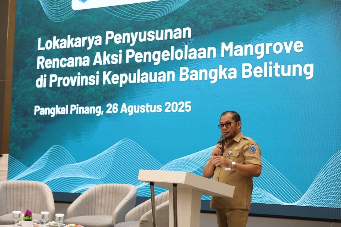Staf Ahli Bidang Ekonomi, Keuangan dan Pembangunan Pemprov Babel, Eko Kurniawan, mewakili Gubernur Hidayat Arsani saat membuka Lokakarya Rencana Aksi Konservasi Pengelolaan Mangrove di Aston Emidary Bangka Hotel & Conference, Selasa (26/8/2025), menegaskan bahwa pengelolaan mangrove merupakan bagian dari implementasi kebijakan Ekonomi Biru yang tengah diarusutamakan Pemprov Babel.