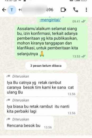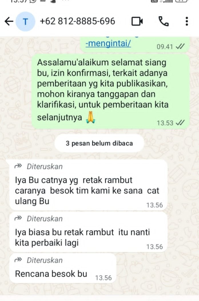 Menanggapi kondisi bangunan yang retak tersebut, awak media mencoba mengonfirmasi Plt Kepala Dinas Kesehatan Kota Pangkalpinang yang lama, dr. Tri Wahyuni Masrohani. Namun, saat dihubungi melalui pesan WhatsApp, dr. Tri hanya meneruskan balasan dari seseorang yang diduga pihak kontraktor atau pengawas pekerjaan. Dalam pesan itu disebutkan bahwa retakan yang terlihat hanyalah “retakan rambut”, yakni retakan tipis pada cat atau plester dinding.