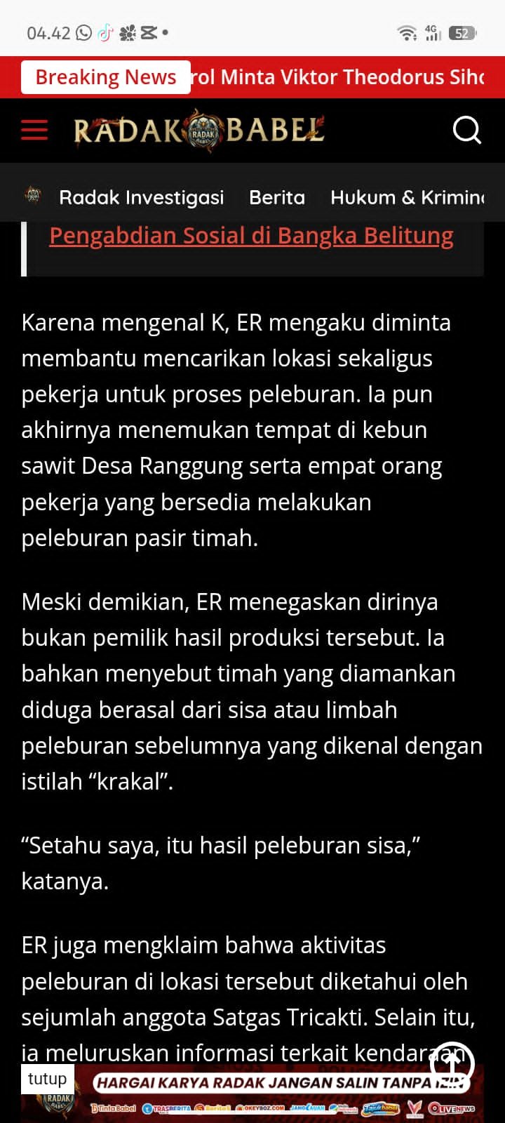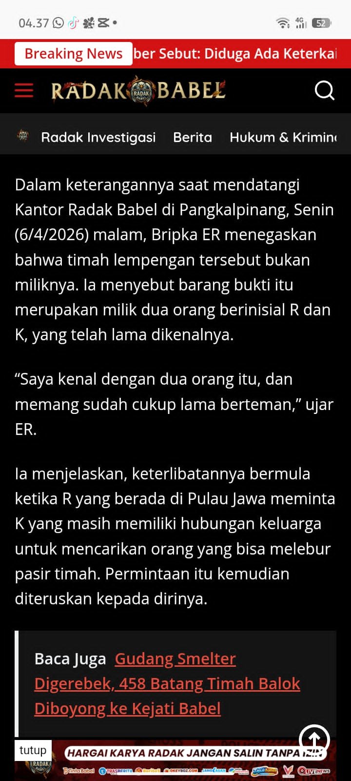 Dalam pengakuannya di kantor Radak Babel, yang kemudian dimuat di media online radakbabel.com pada tanggal 7 April 2026, ER berdalih bahwa timah yang diamankan bukan miliknya, melainkan milik dua orang berinisial R dan K. Ia juga mengaku hanya “membantu” mencarikan lokasi serta pekerja untuk aktivitas peleburan di kebun sawit Desa Ranggung. Dalih yang sekilas terdengar defensif, namun justru membuka ruang tafsir yang jauh lebih serius: sejak kapan seorang anggota polisi berperan sebagai fasilitator aktivitas yang patut diduga ilegal?