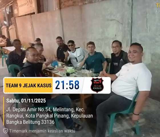 Pertemuan yang berlangsung sekitar pukul 21.58 WIB ini dihadiri oleh Kapolres Bangka Barat, AKBP Pradana Aditya Nugraha, S.H., S.I.K., dan Kepala Dinas PUPR Kabupaten Bangka Tengah, Fani Hendra Saputra, S.Si.T., M.H., bersama Ketua Tim 9 Jejak Kasus, Maulana, serta Sekjen Mung Harsanto, S.E., beserta jajaran pengurus dan anggota lainnya.