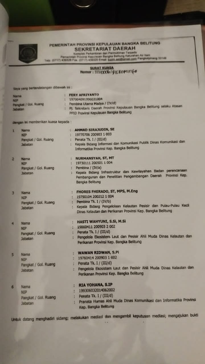 Di tengah rangkaian gugatan tersebut, Edi mengungkap bukti baru berupa surat kuasa resmi yang ditandatangani oleh Pj. Sekda Babel, Fery Afriyanto selaku atasan PPID Pemprov Babel. Surat bernomor 555/0066/Diskominf… itu memberi mandat kepada enam pejabat lintas OPD, mulai dari Dinas Kominfo, Dinas Kelautan dan Perikanan, hingga Bappeda, untuk hadir dan mewakili pemerintah dalam persidangan Komisi Informasi.