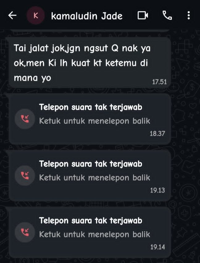 Sosok Kamal diketahui lebih dulu mengirimkan pesan singkat kepada EM dengan kata-kata yang dinilai tidak pantas dan bernada menekan. “Tai jalat jok,jgn ngsut Q nak ya ok,men Ki lh kuat kt ketemu dimana yo,” ujar Kamal dalam pesan singkatnya.