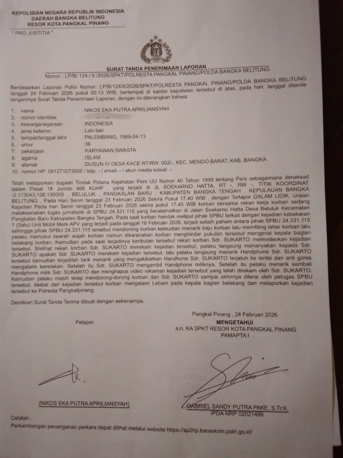 Laporan tersebut teregistrasi dengan Nomor: LP/B/124/I/2026/SPKT/POLRESTA PANGKALPINANG/POLDA BANGKA BELITUNG.