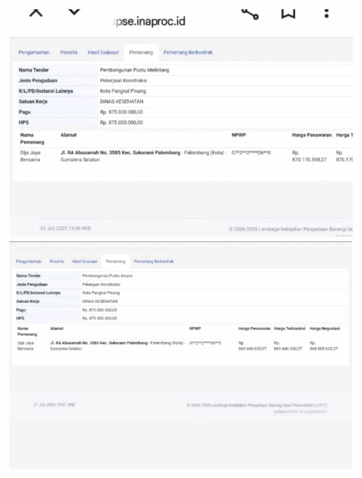 Indikasi pelanggaran muncul dalam dua paket pekerjaan pembangunan Puskesmas Pembantu (Pustu) Melintang dan Pustu Ampui. Keduanya dimenangkan oleh perusahaan yang sama, PT. DJB asal Palembang, dengan nilai penawaran masing-masing Rp 870.170.598,27 dan Rp 869.885.630,37. Yang lebih janggal, kedua proyek ini memiliki pagu dan HPS identik: Rp 875 juta.